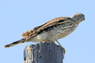 Sharp-shinned Hawks often pounce on their prey from concealed locations on perches, catching prey both on the ground and midair. Their diet mainly consists of songbirds that are robin-sized or smaller. However, slightly bigger birds, rodents, and insects also appear on the menu. Adults will typically bring back smaller prey items for their young. Adult “sharpies” will continue to bring back food to their young for a little while after the young have fledged.