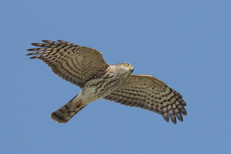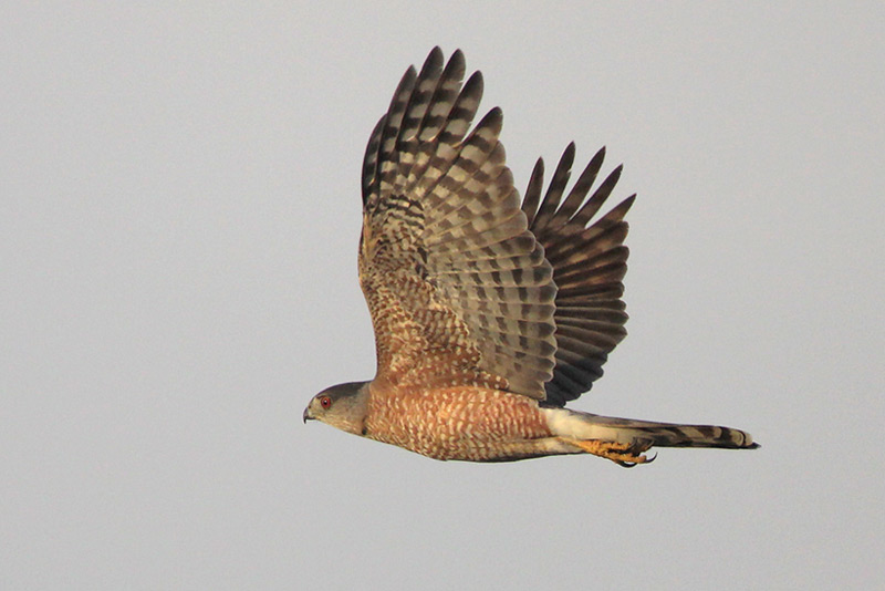 The Sharp-shinned Hawk gets its name from the thin ridge on its lower legs. They are the smallest hawk in North America. At maturity, these hawks have small dark grey head, nape, wing, and backside, light rufous barring on the cheeks, throat, and underside, and fine horizontal black and white barring on the lower two-thirds of the wings. Juvenile birds will have more brown than gray on the top half of their body and will have thicker brown and white vertical barring on their undersides. They possess long square tails with six thicker black and grey horizontal bars, which can differentiate them from Cooper’s Hawks and can help Sharp-shinned Hawks navigate around trees while flying through dense woodland, giving them an added advantage for capturing their prey.