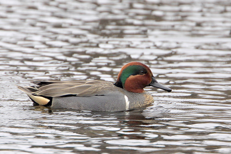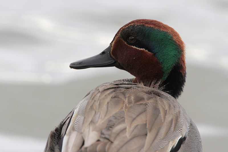 Male Green-winged Teal have black bills, red-brown heads with a thick green band stretching from the eyes to the nape of the neck, white bands on the shoulders, lighter tan speckled breasts, thick, dark-green bands on the lower parts of the wings, and thinner white bands bordering the green on the top and bottom.