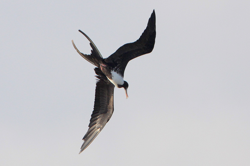 Even when compared to other similarly-sized seabirds, the Magnificent Frigatebird soars and maneuvers mid-air with extreme ease. Unlike other seabirds, however, the Magnificent Frigatebird does not swim or dive, rather it prefers to feed by snatching food from the surface and stealing from other seabirds.