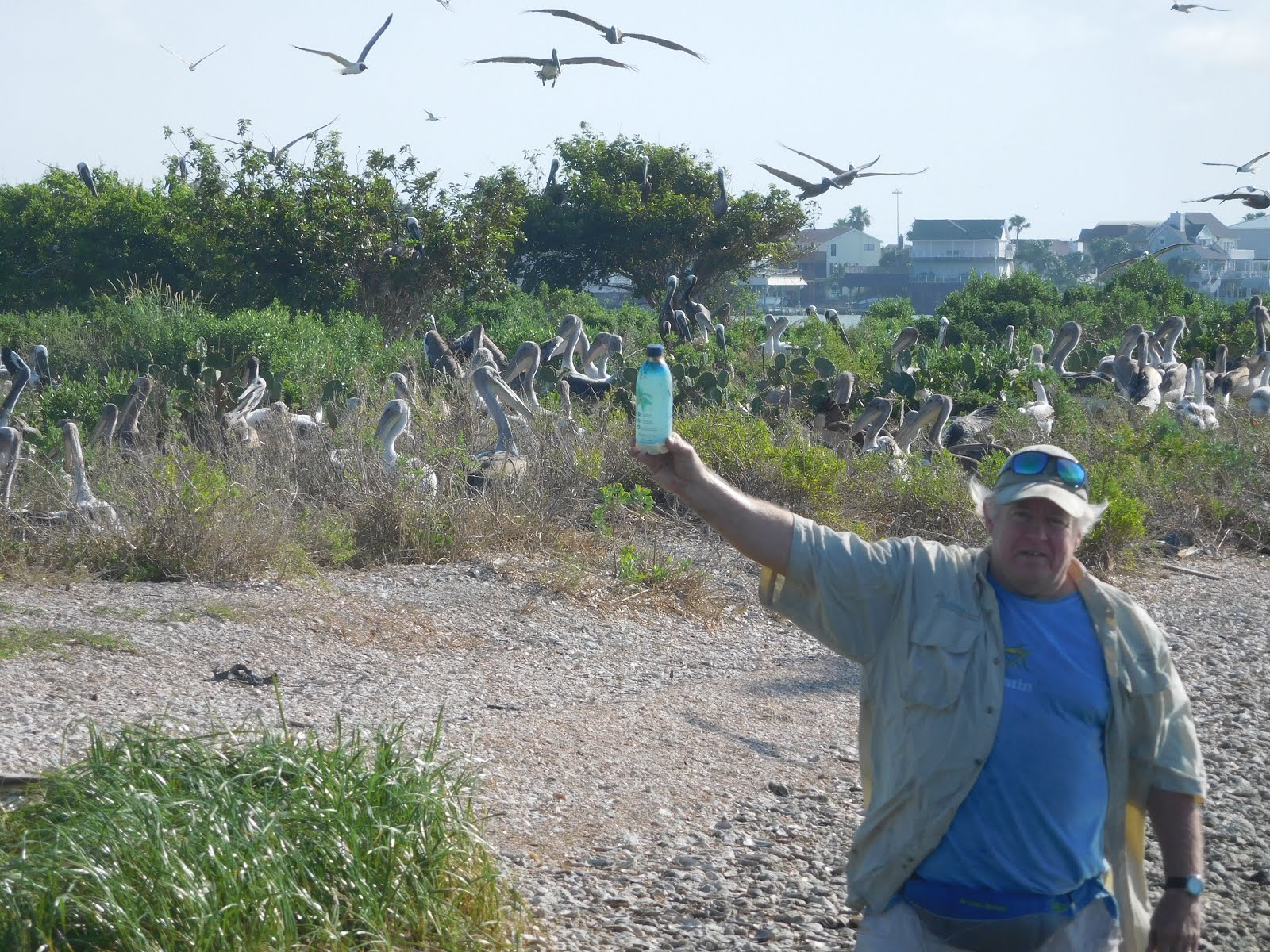 During the 2020 survey of North Deer Island, Houston Audubon staff noticed a pelican chick with an unusual bulge in its gular pouch which, upon further inspection, staff realized was caused by a discarded plastic bottle. Thankfully, Audubon Texas Warden, Dennis Jones, was able to approach and remove the bottle from the lucky young Pelican’s pouch.