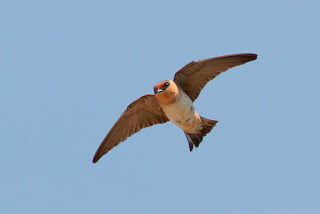 The Cave Swallow is an increasingly common species in the greater Houston area. At first glance, the Cave Swallow appears very similar to the closely related (and more abundant) Cliff Swallow. Both species are generally light below and darker above, both species have a buffy rump patch that is easily visible in flight, and both species are often seen foraging for insects in open areas. However, the Cave Swallow is slightly smaller and, if you look closely, the Cave Swallow also has a lighter buffy throat and a darker forehead than does the Cliff Swallow.