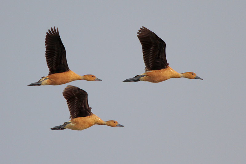 Fulvous Whistling-Ducks have long necks and long legs, which give them a different overall shape from many other North American waterfowl, especially when standing or walking on land. They are warm brown overall, with a darker brown back and wings. When seen in flight from below, their dark wings contrast against their light buff-colored body, giving them a multi-colored appearance. They usually travel in small flocks, which can often be detected by the near-constant whistling calls these ducks give in flight.