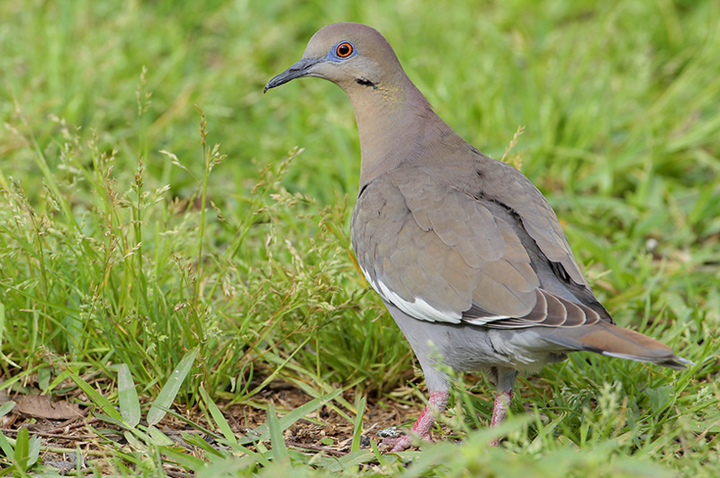 If seen closely, the White-winged Dove’s red eyes and surrounding blueish patch are helpful for identification. While it is similar to the more familiar and widespread Mourning Dove, the White-winged Dove’s namesake white wing patches and shorter tail readily set it apart.