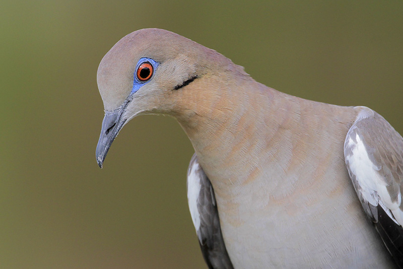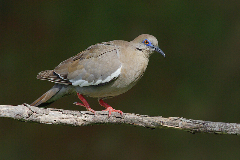 In large parts of its breeding range in the desert southwest, the White-winged Dove is known to help pollinate saguaro cactuses. In Southeast Texas and east along the Gulf Coast to Florida, the White-winged Dove has adapted well to residence year-round in urban areas and can be seen frequenting local parks and visiting feeders. The White-winged Dove is light grayish-brown overall, with a dark patch on the sides of its neck. Striking large white patches in its wings and white corners to its rounded tail are readily visible in flight. When seen perched, the White-winged Dove’s white wing patches are visible only as a white strip on the lower edge of the wings.