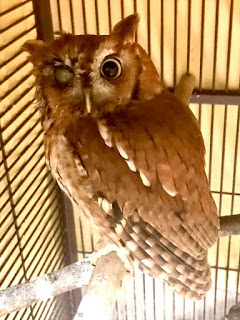 Not long after we welcomed Standish, we received word of another rehabilitated raptor that was in need of placement. The call came from a little closer to home¬–Friends of Texas Wildlife in Magnolia had found a rufous-morph Eastern Screech-Owl in January that had been hit by a car. The owl, named Pierre, had suffered a major eye injury and his right eye could not be saved. Thanks to the staff at Friends of Texas Wildlife, Pierre has recovered as best as possible and is now living with Percy, our gray-morph Eastern Screech-Owl. Percy has also sustained permanent damage to his left eye, so they are a great pair!
