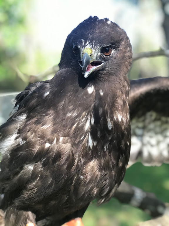 Last Thanksgiving, a dark-morph Harlan’s Red-tailed Hawk was found in Montana with a badly injured wing. He was rescued and taken to Ironside Bird Rescue in Cody. Because part of his wing was missing, we believe that he may have been hit by a car or flew into some power lines. He went through surgery to clean the wing, but is no longer able to fly. Thanks to our great friends at Ironside Bird Rescue, Standish was brought to the Raptor Center, where he joined the team as one of our education ambassadors. Standish was named after Plymouth Colony’s military advisor, Myles Standish, because he was found on Thanksgiving Day. When you visit, you will be able to see three different colorations of Red-tailed Hawks: a rufous-morph western Red-tailed Hawk, a light-morph Harlan’s, and a dark-morph Harlan’s.