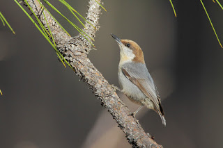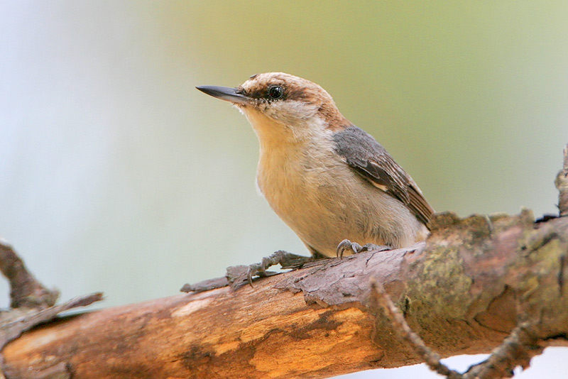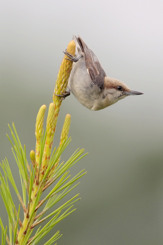 Often found clinging to tree trunks and branches, the Brown-headed Nuthatch is equally at home climbing upward and downward among the high branches of pine forests. Their rather unique habit of walking down tree trunks headfirst may appear silly, but it comes in handy when they are foraging for insects in the deep crevices of pine bark or gathering seeds from within pine cones.