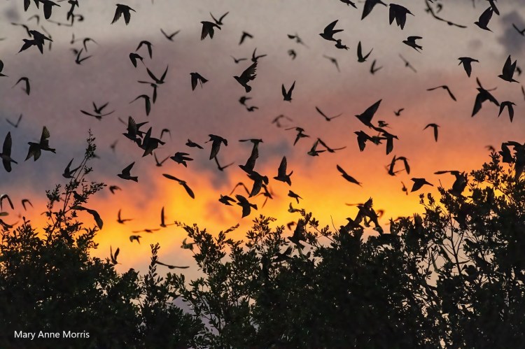 Even more exciting than the arrival of the early scouts is the spectacular fall “staging” for migration, which is also known as migratory roosting. Surprisingly, many people are unaware of the amazing opportunity right here in Houston to experience the amassing of thousands to hundreds of thousands of Purple Martins as they prepare for fall migration back to various countries in South America (although most of them winter in Brazil). This staging is a type of communal roosting where Purple Martins gather to socialize, rest, and fatten up before their long migration. Prime migratory roosting takes place over a period of about 6 to 10 weeks, typically towards the end of July and through the end of September, more or less. Individuals and groups of birds move in and out of the roosting area, but more continue to arrive and the numbers can grow to thousands. Smaller numbers and later migrants may also be seen at these roost sites outside of the prime period.