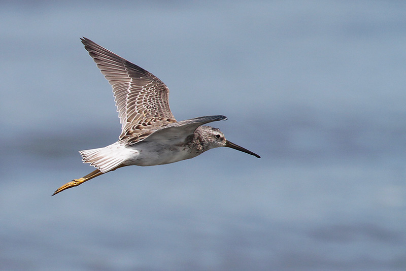 It actually belongs to the Calidris genus with the “peeps”, including Least Sandpipers and Dunlin. However, it has long, yellow-green legs and a long, drooping black bill that give it a yellowlegs appearance. It is also relatively large for a peep, being around the size of a Lesser Yellowlegs. In the breeding season from April to August, it has heavy, dark barring with a rufous cap and cheek patch. This ornate plumage fades to a dull gray in the nonbreeding season, although it keeps its distinct white eyebrow year-round. In flight, you may notice a white rump and a white band under the wings.