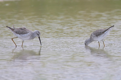 Perhaps the easiest way to identify a Stilt Sandpiper is by their foraging behavior. They are often seen in belly-deep water, probing deeply and rapidly in mud, similar to the sewing machine style of dowitchers. However, they move up and down frequently like an oil rig, tilting their tails into the air. While their foraging style may be reminiscent of dowitchers, their bill is much shorter and narrower.