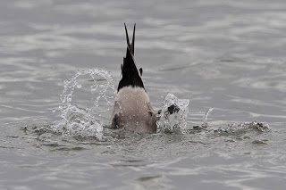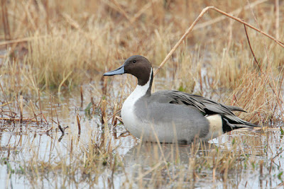 The Northern Pintail feeds on seeds and aquatic insects, which they usually find by up-ending while swimming, tipping forward and dabbling at food under the surface of the water. When feeding in this manner, their uniquely long necks allow them to reach food items that are up to a foot under the water surface, beyond the reach of other dabbling ducks like Mallard or Blue-winged Teal.