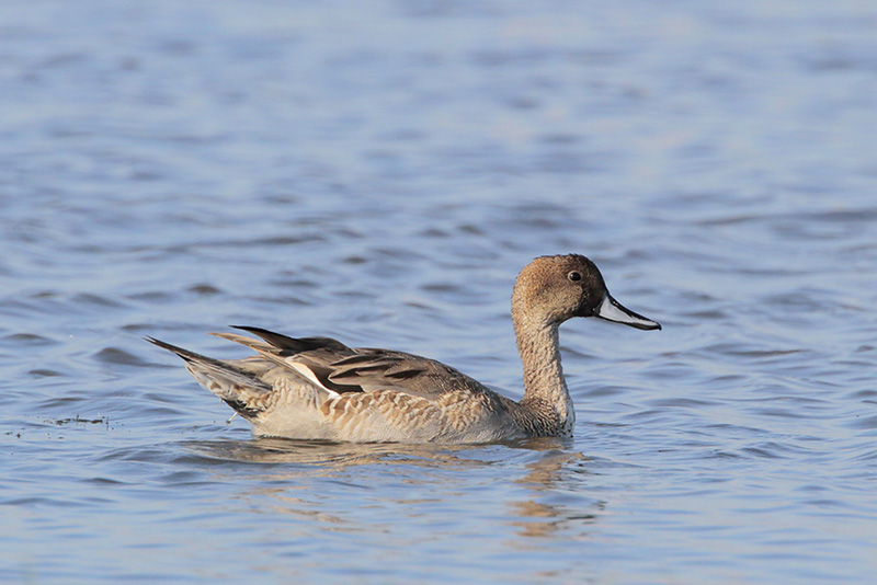 The Northern Pintail is a large duck with a distinctive long-necked, slender shape. Male Northern Pintails are patterned mostly gray and white, with a white stripe extending up the neck onto their otherwise dark brown head. They have a particularly long and pointed tail, for which the species is named, and in flight they show a light tan or whitish border on both the front and back edges of their iridescent green speculum. Female Northern Pintails are less strikingly colored, but they can easily be identified by their overall shape, wedge-shaped tail, and blueish bill.