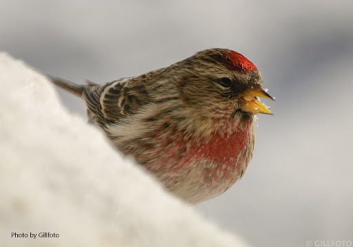 The Common Redpoll is a small finch with a stubby, conical, yellow bill, a dark spot beneath its bill, a red spot on its forehead, dark wings, and dark streaking on the flanks, and upper body. An adult male will have a rosy wash to the breast.