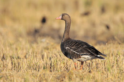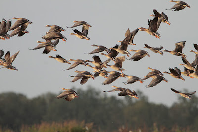 variety, which are slightly darker, migrate from northern Canada and Greenland all the way down to Central Mexico. They prefer open habitats, such as farmlands, marshes, prairies, and ponds, where they often associate with other species of goose. While swimming, Greater White-fronted Geese forage on vegetation in a similar manner as dabbling ducks.
