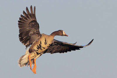 Greater White-fronted Geese are smaller than Canada Geese and have bright orange legs. They are brownish-gray with white undertail coverts, black barring on their belly, and white feathers around their pink bill. In fact, the scientific name albifrons means “white forehead” in Latin. However, juveniles lack this namesake white front as well as the black barring. As they are often seen flying overhead, it is helpful to remember a few in-flight field marks. They have a pale gray upper wing, a white tail tip, and a black tail and rump with a distinctive white “U” shape. Greater White-fronted Geese are very similar in appearance to a Eurasian species, the Lesser White-fronted Goose, which is smaller and has a yellow eye ring.
