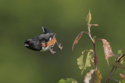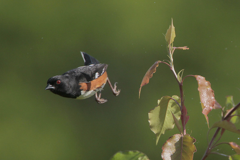 Eastern Towhees are known to be a rather antisocial species. Towhees will often threaten other towhees who venture too close. Males will flash their white tail spots to scare off other males from their territories. They are just as unwelcoming to females as they are to males, at least at first. Male Eastern Towhees take a few days to warm up to females, eventually becoming inseparable companions. As the sole nest builders, female Eastern Towhees will build their nests in leaf litter on the ground. Sometimes, however, they will build their nests in vine tangles a few feet off of the ground.
