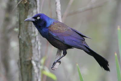 When it comes time to build a nest, females will first scout out possible nest locations, occasionally accompanied by their partners. The female may change her mind after she has started to build the nest, and will try another location. Nest building is mainly done by females, and can sometimes take up to six weeks to complete. Male Common Grackles may assist females in nest building, and repair. Typically, a nest is built high in a coniferous tree near water or near an open area. Common Grackles have been known to nest in other species’ occupied nests. In addition to foraging for small vertebrates and large invertebrates, Common Grackles will invade other birds’ nests for “protein packets.”