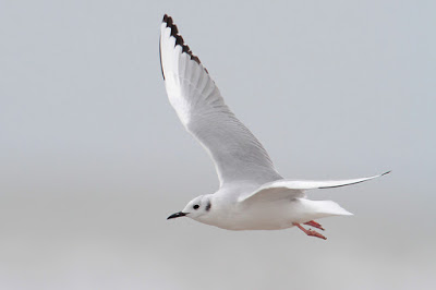 They can be identified by their thin, black bill, which is much slimmer than that of a Laughing Gull. Bonaparte’s Gulls are actually the third smallest species of gull after the Little Gull and Saunder’s Gull. First winter birds show the classic dark “M” shape across the wing in flight and have a black spot behind their eyes. Nonbreeding adults retain this ear-spot and pink legs but have a uniform, pale gray back. In the breeding season, adults develop red legs and a black hood with white eye crescents thinner than those of a Laughing Gull. In flight, they can be identified by a wedge of white outer primary feathers with black wingtips. The underwing is pale, whereas the underwings of Little Gulls are dark.