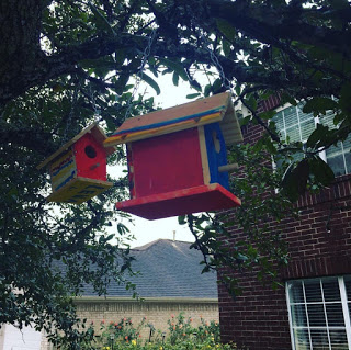 Indeed, after applying a haphazard coat of brightly-hued paints – as only a first-grader can do – twisting in the tiny screws on every corner of the aviary abode, we hung 3 bird houses from our live oaks in the front yard. With noses pressed against the living room window, we eagerly anticipated a flurry of feathers and happy chirps.