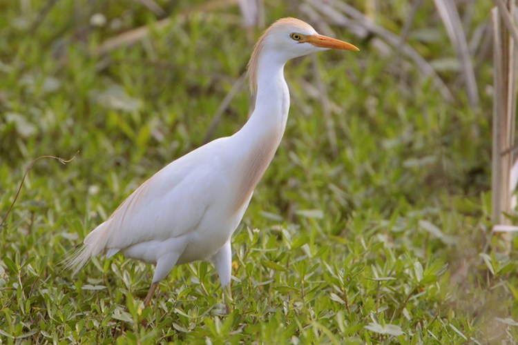 The stout white Cattle Egret is most often seen in fields rather than shallow water with other herons and egrets. It prefers to follow grazing cattle (hence the name) as well as tractors and mowers, snatching up small lizards and insects that scatter after the disturbance. The Cattle Egret is not native to the Americas; however, it has spread rapidly since it first arrived to northeastern South America from Africa in 1877. It is not known whether their arrival was human assisted or if they made it on their own steam, but since then they have spread rapidly across the western hemisphere. They were first observed in the U.S. in 1941, with the first nests observed in 1953. They are currently common throughout the southern U.S. in summer but have been observed throughout North America, even as far north as Alaska. Cattle Egrets are also established year round residents throughout much of Central and South America.