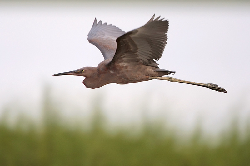Throughout coastal flats, saltmarshes, tidal ponds, and lagoons, the Reddish Egret excitedly forages for prey—primarily fish—accomplishing what many birders call a “drunken dance.” The bird hunts shallow water, lurching back and forth, half-jumping and half-marching, its wings half-extended or flicking open up around its head. An unusual spectacle, certainly, but one with purpose—to disturb prey, which it then strikes and, if successful, tosses into the back of its throat.