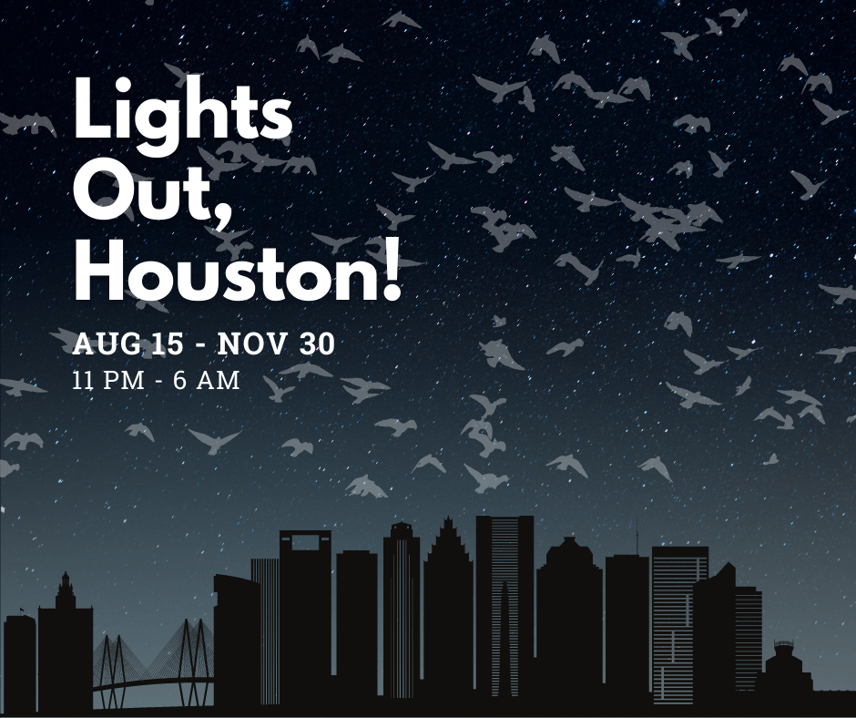 Most North American migratory birds fly at night, and lights on buildings can disorient birds on their paths, resulting in fatal collisions. As we all know, the Upper Texas Coast plays a key role on the Central Flyway, an important migratory path for birds. Birds that move along and across the Gulf of Mexico depend on safe passage through the Houston-Galveston area. Throughout migration, and particularly during weather events, turning lights out can make a big difference.