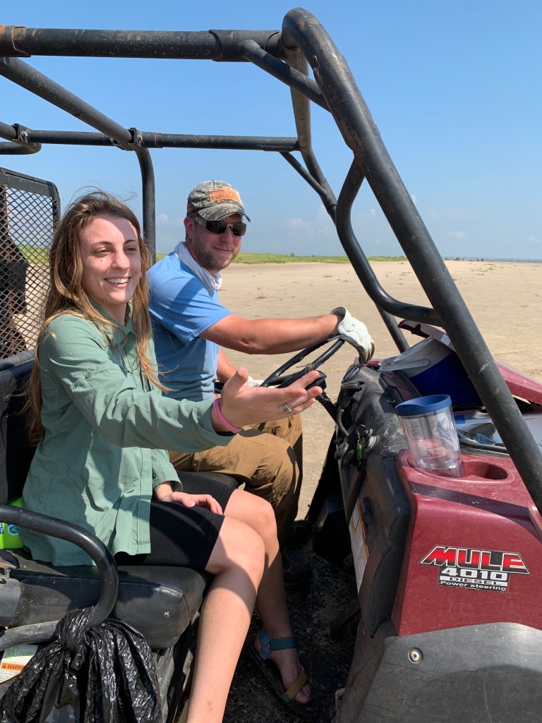 Many of the volunteers drove over from Houston in the morning and took the ferry, getting an opportunity to delight in the bottlenose dolphins in the ship channel. Another close wildlife encounter happened when one volunteer stumbled on a complete shed snake skin when he was picking up litter at the edge of the dunes. Everyone was excited by the find and Coastal Sanctuaries Manager Pete Deichmann showed it off to the Girl Scout troop that celebrated their hard efforts by taking a swim in the Gulf. Mother Nature seemed to thank us when a dragonfly landed on one volunteer’s fingertip and perched there for a few photos, while butterflies were seen flitting about in the sea air.