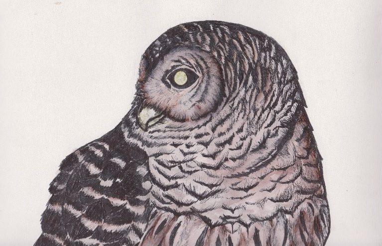 Juliet the Barred Owl also bid farewell in 2021. Juliet spent almost her entire life as an education ambassador after being found as a young juvenile with a badly broken wing. As she got older she developed a significant cataract in her left eye that looked like the moon. She was filmed by National Geographic for an episode of Nat Geo Animal ER with the vets at Gulf Coast Avian and Exotics concerning her cataract. She passed on the night of a full moon and is remembered by so many that had a chance to meet her at the Raptor Center or see her in action at a program. Education team member and artist Javier Salas created a beautiful sketch of Juliet with the moon in her eye last year.