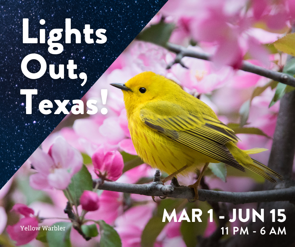 An incredible 600+ species of birds have been documented in Texas, and more than 400 species have been observed in Harris county. Many of these birds briefly stop by on their spring and fall migration, and a big part of that journey happens at night. About 80% of North America’s migratory birds migrate entirely at night, relying on the more stable nighttime weather conditions and light from the stars and moon to help navigate. What has always been an arduous journey has become even more complicated for birds with the addition of cityscapes and artificial light along these flyways.
