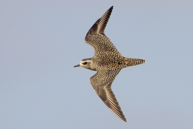 These birds have one of the largest migration distances, flying upwards of 20,000 miles from their breeding grounds in the Arctic to their wintering grounds in South America. American Golden-Plovers prefer to feed in farm fields and grasslands, so they are less common along shorelines where their cousin the Black-bellied Plover lives. They feed on insects, small invertebrates, and seeds, using their thin beaks to pick up food and probe the dirt.