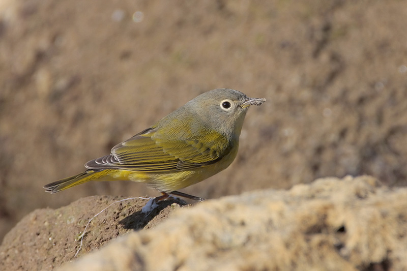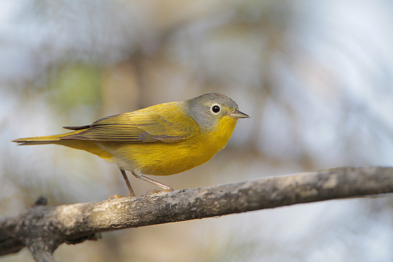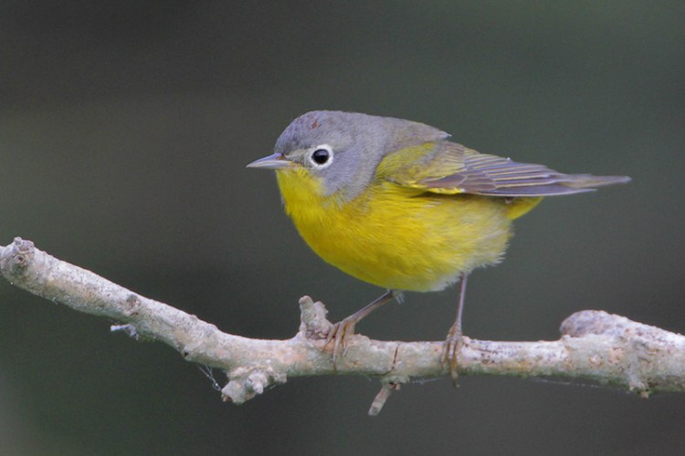 The Nashville Warbler is a small bird with a yellow underside, olive back, and gray head. They also have a white eye-ring and a little spot of chestnut on their crown, although this is often not visible. These birds move between branches, picking insects off leaves. They prefer secondary growth and scrubby habitat.