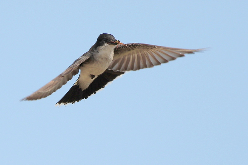 Eastern Kingbirds, like many other flycatchers are insectivores meaning they eat insects. They will perch on something about ten feet off the ground like a bush or fence post then quickly swoop in and catch prey, bringing it back to the same perch to control and swallow the insect, this behavior is common across the flycatcher family and is referred to as “sallying.” If no perch is available kingbirds are perfectly content catching smaller prey and swallowing while in mid-air.