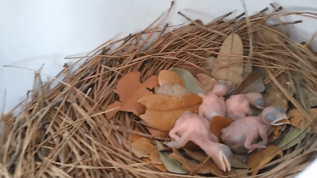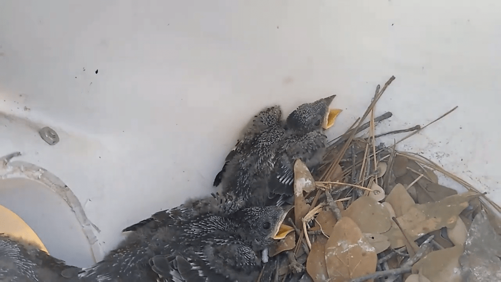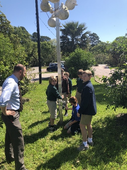 Because it was the Purple Martins’ first time using the gourds, we were afraid to lower the gourds too often that first year, so we don’t have an accurate count for the number of hatchlings that were raised that year. The following Spring, in 2019, we began lowering the gourds for inspection, and incorporated the study of Purple Martins into our 5th grade Natural History curriculum. What a joy to see the faces of my 5th graders displaying amazement at the diminutive size of the Purple Martin eggs, and to compare their white color to the larger, pale blue eggs of the Starling, and the smaller, grey and speckled-brown eggs of the House Sparrow. What a pleasure to have students wonder at seeing the newly hatched babies so close, or marvel at seeing pin feathers on a fledgling!