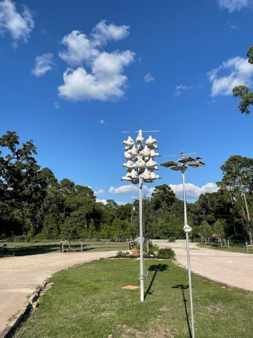In the summer of 2017 Mary Anne put me in contact with Matthew Fendley, a Purple Martin Landlord at the University of Houston. Matt graciously drove out to Western Academy to offer advice on our setup. Matthew was extremely knowledgeable and helpful, explaining that the gourds we had put up (and that were now occupied with House Sparrows) had crescent entrances. Although these entrances were designed to be starling proof, we had seen at least one starling easily pass through. The crescent-shaped entrance wasn’t ideal because Martins sometimes got trapped and stuck in the entrance hole (this primarily happens when Martins are fighting over a gourd). Matt suggested switching to gourds with Conley II starling-resistant entrances, which are easier for the Martins to learn to use and accept. He also suggested we use gourds with Troyer tunnels; the long horizontal tunnel neck prevents predators like raccoons and great horned owls from reaching into the nest cavity, and seem to be preferred by Martins. A further suggestion was to upgrade the regular inspection caps with new heavy-duty caps that included venting, allowing for a cooler interior to the gourds. Taking all this to heart, in 2018 we purchased a complete Purple Martin pole system with a 3-inch pole and winch for raising and lowering the gourds. The Purple Martins loved their new set-up!