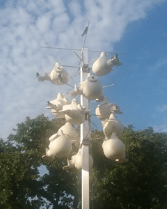 What a joy to hear the Purple Martins chortling above campus, and watching them circle and swoop above our heads! Because the metal house was permanently fixed to the top of a pole, there was no way to lower the house and count eggs or check on the Purple Martins, so we have no accurate numbers from those first few years. Mary Anne donated several white gourds, which we hung beneath the metal house, but the Purple Martins seemed to prefer the higher cavities and House Sparrows moved into the gourds. A few House Sparrows and at least one European Starling pair moved into some of the upper chambers as well. For three years we used the hexagon Martin house, enjoying the return of the Purple Martins to campus each April. Every year we waited with eager anticipation for the distinctive chortling and flying antics of these harbingers of Spring!