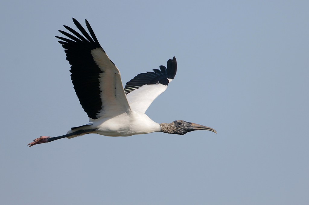 Wood Storks are large wading birds with long legs, a long curved bill, and a bald head and neck. They are mostly white with black flight feathers. Wood storks tower over most other wading birds standing over 3 feet tall. They often soar high in the sky, sometimes riding thermals with vultures or other raptors. In flight their large size, long necks, white body with black flight feathers extending across the entire wing make them distinctive. Juveniles look like adults but have lighter bills and gray neck feathers which they slowly lose over time.
