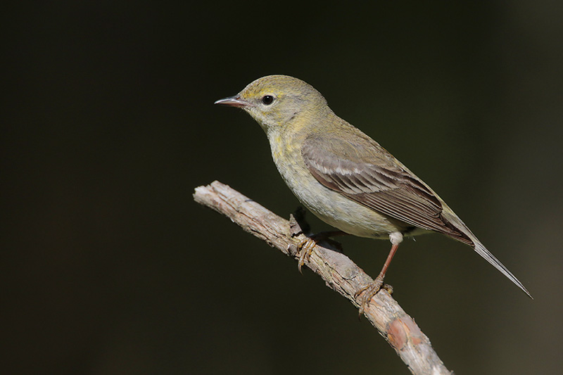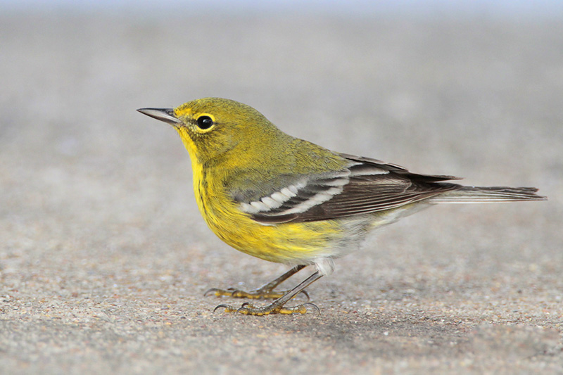 Pine Warblers are yellowish birds with olive backs, whitish bellies, and two prominent white wingbars on gray wings. Adult males are the brightest; females and immatures are more subdued and can even appear gray-brown. No bird is more aptly named: it nests exclusively in pine trees, spends much of its life there, and only during migration is found in shrubbery or the deciduous growth of parks and gardens.