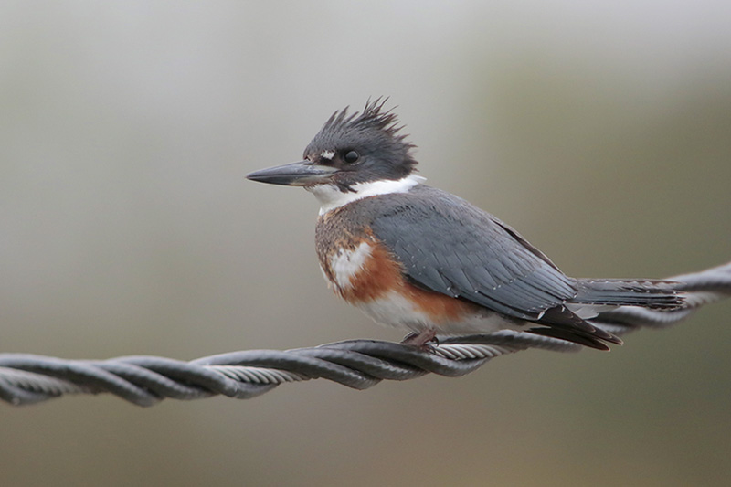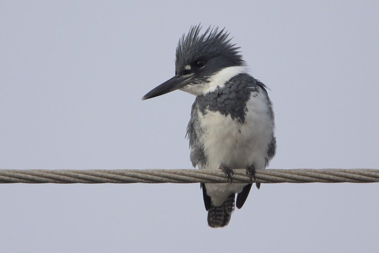 These medium sized birds are often conspicuously perched on branches or power lines and are easily distinguished by their large head, distinct shaggy crest, and long stout bill. Belted Kingfishers are 13 inches long on average and have a gray-blue head, back, and stripe across the upper breast. Both sexes also have a pronounced white collar, and a white belly. Females can be distinguished by the chestnut stripe across the lower breast, while the males are plain white underneath. Juveniles of both sexes can have chestnut coloring on the breast and belly.