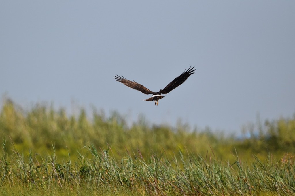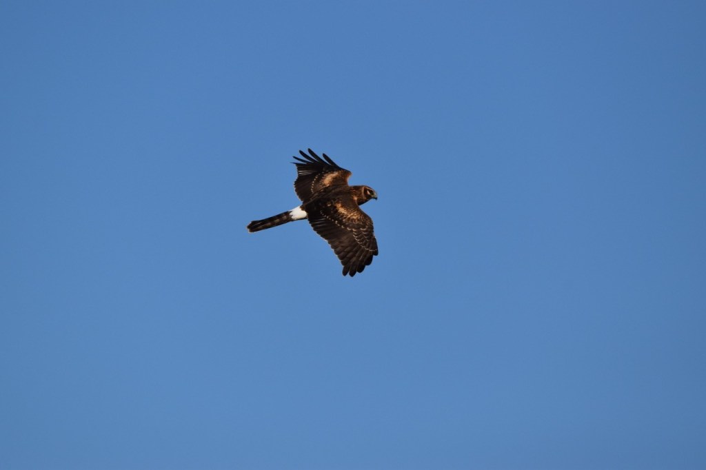 These birds are medium sized hawks with long tails, broad wings, and distinctive white rump patches. The main characteristic that separates Northern Harriers from other hawk species is that they have what is called a “facial disk” similarly to owls. This disc shape helps funnel sound directly to the bird’s ears, allowing it to be much more precise and efficient when hunting small animals while soaring over open habitats. Northern Harriers typically prey on small mammals such as mice and voles but have also been known to feed on reptiles, amphibians and even songbird species.