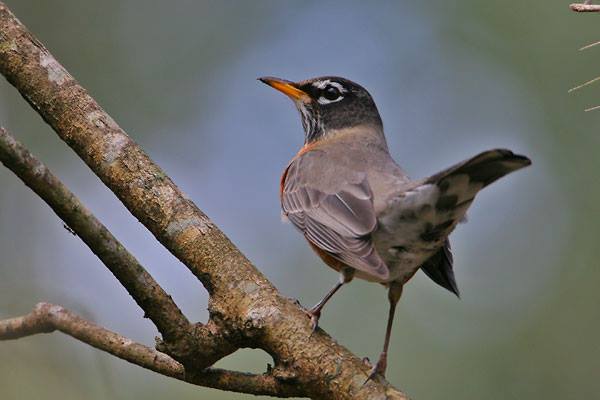 The American Robin is a large gray-brown songbird with warm, brick red underparts, darker head, and broken, white eye ring. Robins are the largest of North American thrushes and they offer a good chance to learn the shape of most thrushes. They have a large, round body, long legs, and a fairly long tail. In flight you can observe a white patch on the lower belly and under the tail. Females have paler heads than males that contrast less with their gray back. Their song consists of rich caroling notes, rising and falling in pitch. They are common across the continent in gardens, parks, yards, gold courses, fields, pastures, tundra, as well as deciduous woodlands, pine forests, shrublands, and forests after fires or heavy logging.
