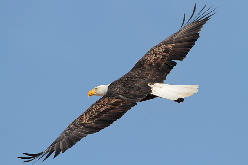 Often recognized as a national symbol of the United States, the Bald Eagle has been the country’s national bird since 1782. Known for their bright white heads and tails and yellow bills, Bald Eagles can be found throughout most of North America. Some areas of the United States host Bald Eagles year-round, typically in coastal areas or near waterways. Other populations of Bald Eagles breed in Alaska and Canada and extend their wintering range south to encompass all lower 48 states.