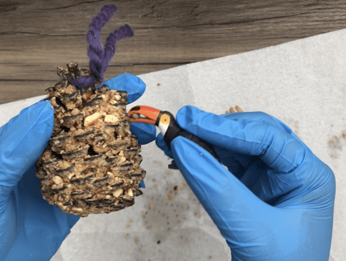 To make smaller bits for birds to consume, combine nuts and roughly chop in a blender or crush by hand. The rule of thumb for calculating how much feed I need is one handful per pinecone. Be sure to wear gloves and put down napkins to keep your workspace clean.