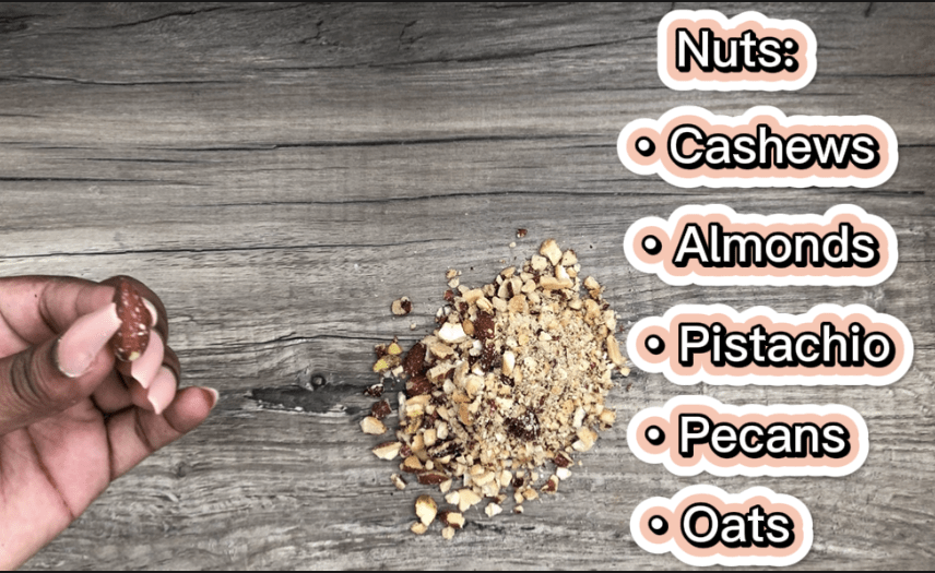 - Any mix of crushed nuts, oats, and dried fruit including: