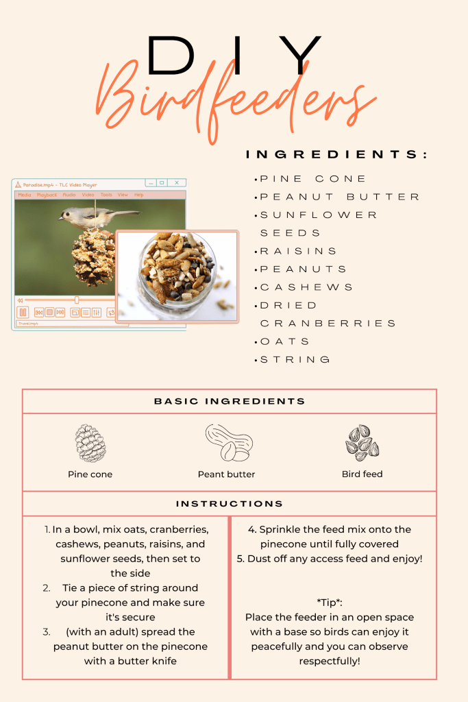 According to Cornell University, 53% of grassland birds have disappeared due to loss of habitat and an increase in infrastructure. Although this may seem unfixable, over 55% of Houstonians own some form of backyard that could serve the purpose of becoming more “bird-friendly”. Being bird-friendly means helping birds in your space by implementing water sources, safe and adequate shelter, or bird food in order to help make birds’ lives easier since they are always under the threat of predation. In order to have a good understanding of bird-friendly spaces, I will show you how to make a bird feeder.