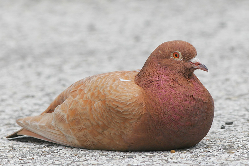 Perhaps the most identifiable bird worldwide, Rock Pigeons are known for their plump form, pink legs, broad wings, and characteristic head bob. After centuries of domestication, Rock Pigeons come in many colors, including brown, white, speckled, piebald, dark, and others. The wild form has a gray body, iridescent neck, white operculum on the beak, and two black wingbars. Pigeon wings make a chaotic noise when taking off. An adept generalist, the Rock Pigeon occupies all continents except Antarctica. However, its native range remains unknown.