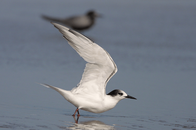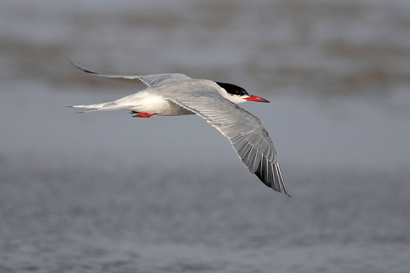 Common Terns are a fairly regular sight along the Upper Texas Coast as they migrate through in the spring and fall. Their numbers here peak in April and October, but a few individuals stick around during summer. One of the medium-sized terns, Common Terns are slightly larger than Least Terns and much smaller than Royal or Caspian Terns. Breeding adults are distinguished from very similar Forster’s Terns by the Common’s slightly shorter legs (giving a more squat appearance), wingtips the same length as the tail streamers when standing, a more reddish bill with a smaller black tip, darker outer primaries, and a slightly thinner bill base. Nonbreeding Common Terns retain a dark arc on their heads, while Forster’s Terns have two dark ear patches. Some standing birds also have a black swoosh on their wings, but this feature is less diagnostic, and birds should be identified using a combination of features. Some birds only seen at a glance are best left unidentified.