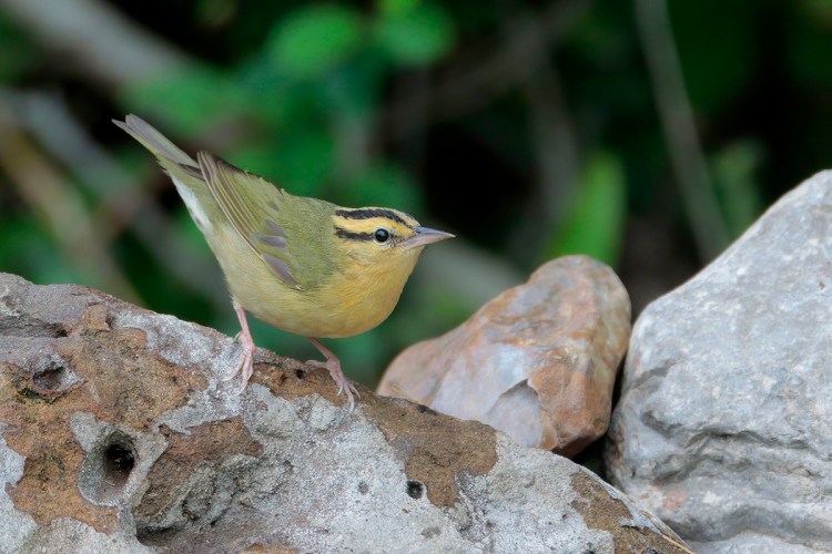 One member of the great menagerie of warblers to visit the Texas coast during spring migration is the secretive Worm-eating Warbler. Previously placed in the same genus as Swainson’s Warbler, this small passerine frequents forest understories and can be difficult to find in the dense shrubs and vegetation it prefers. Its name refers to the many species of caterpillars it consumes (though most warblers eat plenty of caterpillars too). Both sexes of Worm-eating Warblers can be identified by their prominent black streaks on an orange head with a long, pointed bill. The wings are dull olive and lack wingbars, and the breast is unmarked. Following their insect-like trill (similar to that of a Chipping Sparrow) or sharp tseet call is the most reliable method of locating hidden individuals.