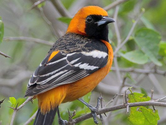 Hooded Orioles forage in sparse trees, taking insects from the leaves and nectar from flowers. They sometimes drink from hummingbird feeders, too. On select palm trees in the southwestern U.S. or northern Mexico, the female weaves a hanging nest about twenty feet off the ground. This elaborate nest is stitched to the bottom of the leaves, much like those made by other oriole species. Hooded Oriole populations have remained relatively stable over the last fifty years; however, parasitic Brown-headed and Bronzed Cowbirds are causing declines in Hooded Oriole populations in the Lower Rio Grande Valley. Interestingly, the planting of ornamental palm trees is allowing Hooded Orioles to expand their range northwards.