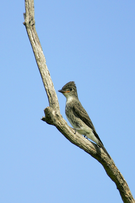 Olive-sided Flycatchers can look very similar to other flycatcher and pee-wee species depending on how one views it. Their characteristic field marks are the dark gray side patches on the breast contrasting with a white patch in the center of the chest. It almost looks like a flycatcher wearing a vest! They have a dark gray back with hints of olive green and long wings compared to the rest of their body. Sometimes the back of the head may have raised feathers so the crown may form a peak like a Northern Cardinal.